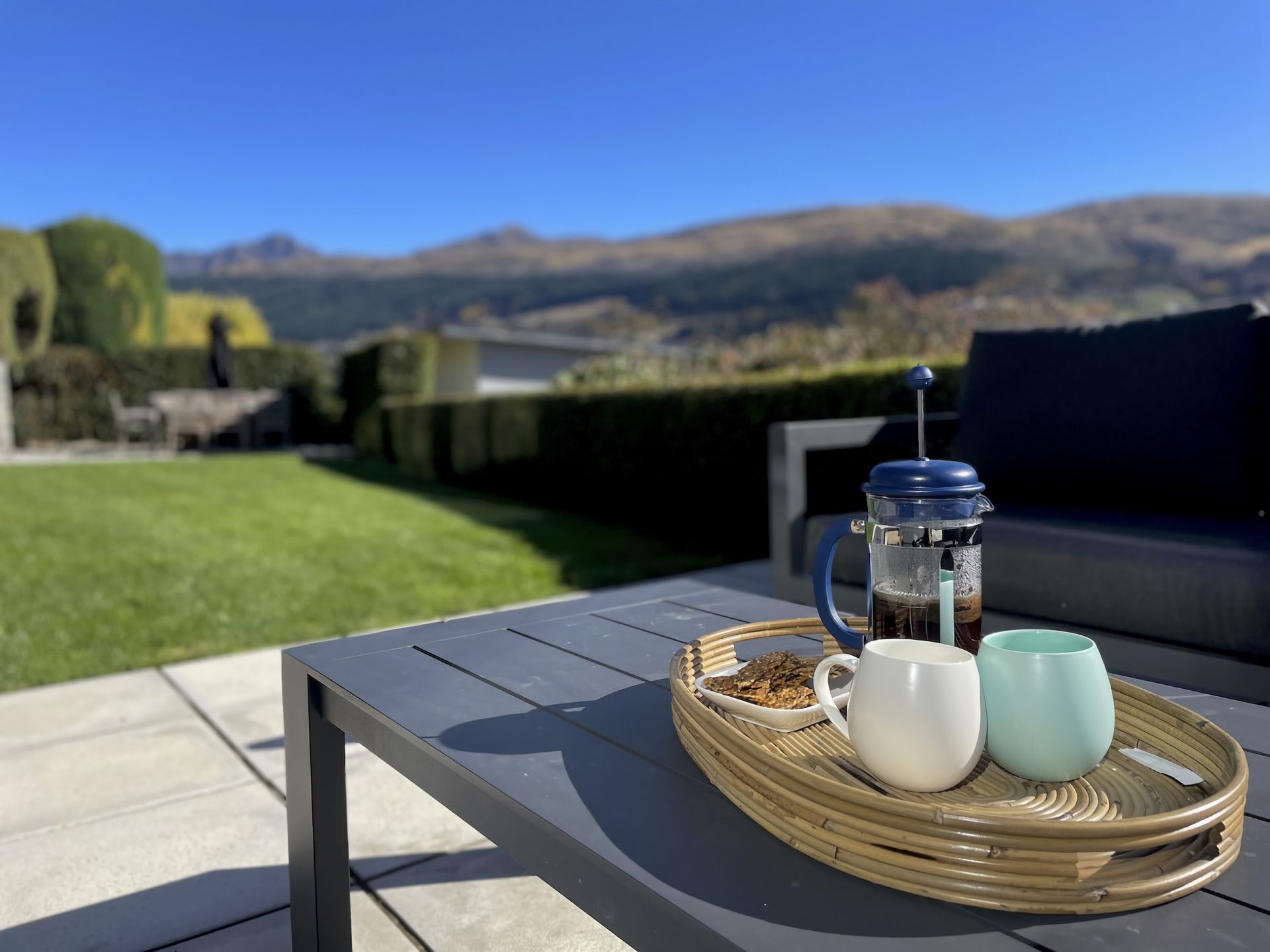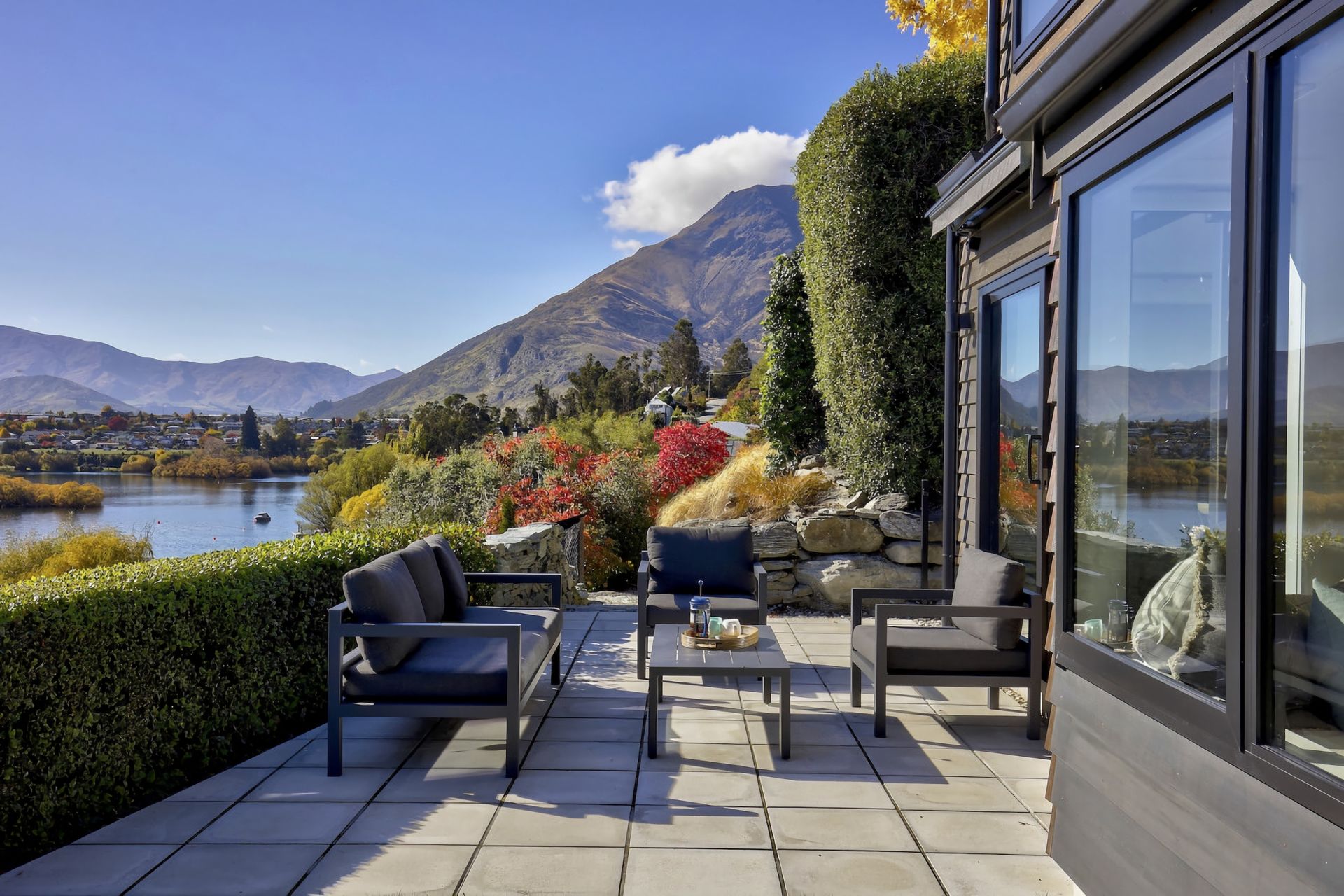 - Private patio and outdoor area with lake and mountain views, and all day sun